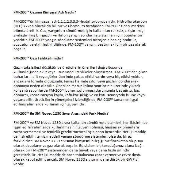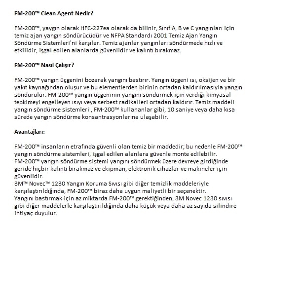 FM200, yangın sırasında oluşan ısıyı emerek yanma reaksiyonunu durduran bir söndürme gazıdır. Gaz, özel olarak tasarlanmış silindirlerde basınçlı olarak saklanır ve yangın algılandığında otomatik olarak devreye girer. FM200, ortamdaki oksijen seviyesini tehlikeli derecede düşürmeden yangını söndürdüğü için insan sağlığı açısından güvenlidir.